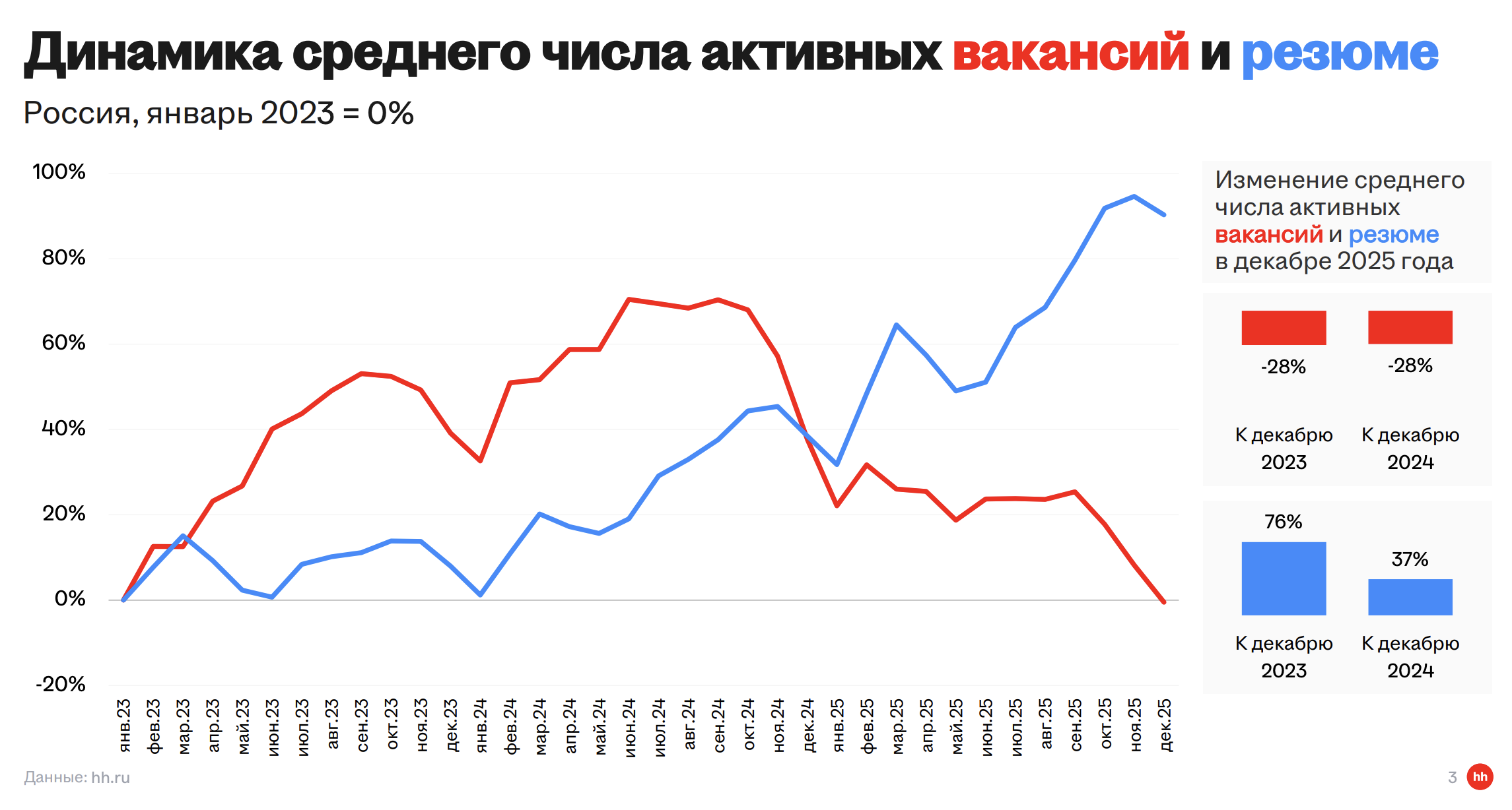 Безработица в России держится на уровне около 2,2-2,4%, и это всё ещё исторический минимум. Однако конкуренция среди белых воротничков за 2025 год выросла в полтора раза: на одну вакансию теперь 5-6 резюме вместо прежних 3-4. Количество вакансий упало на четверть, число резюме выросло на треть.